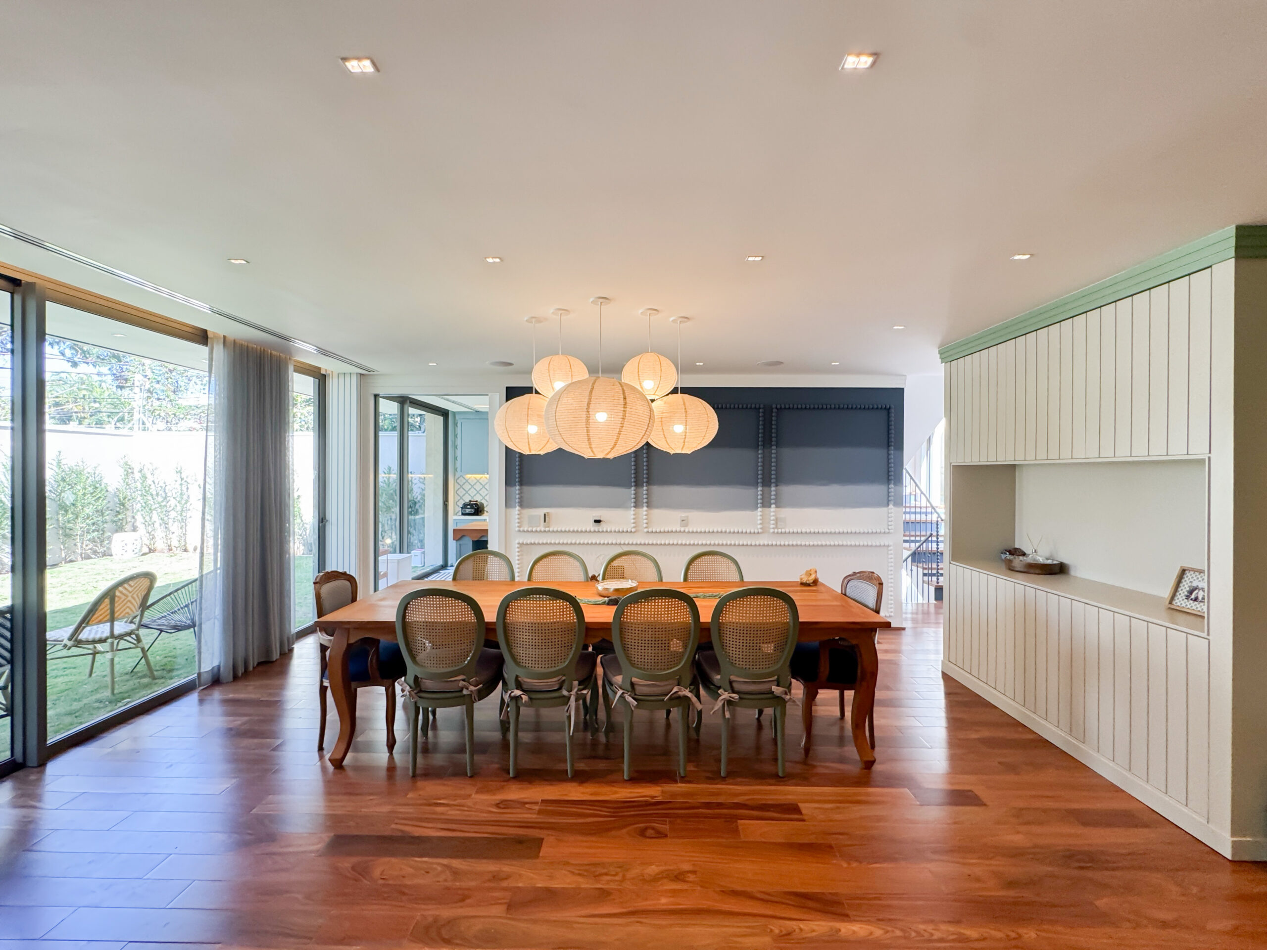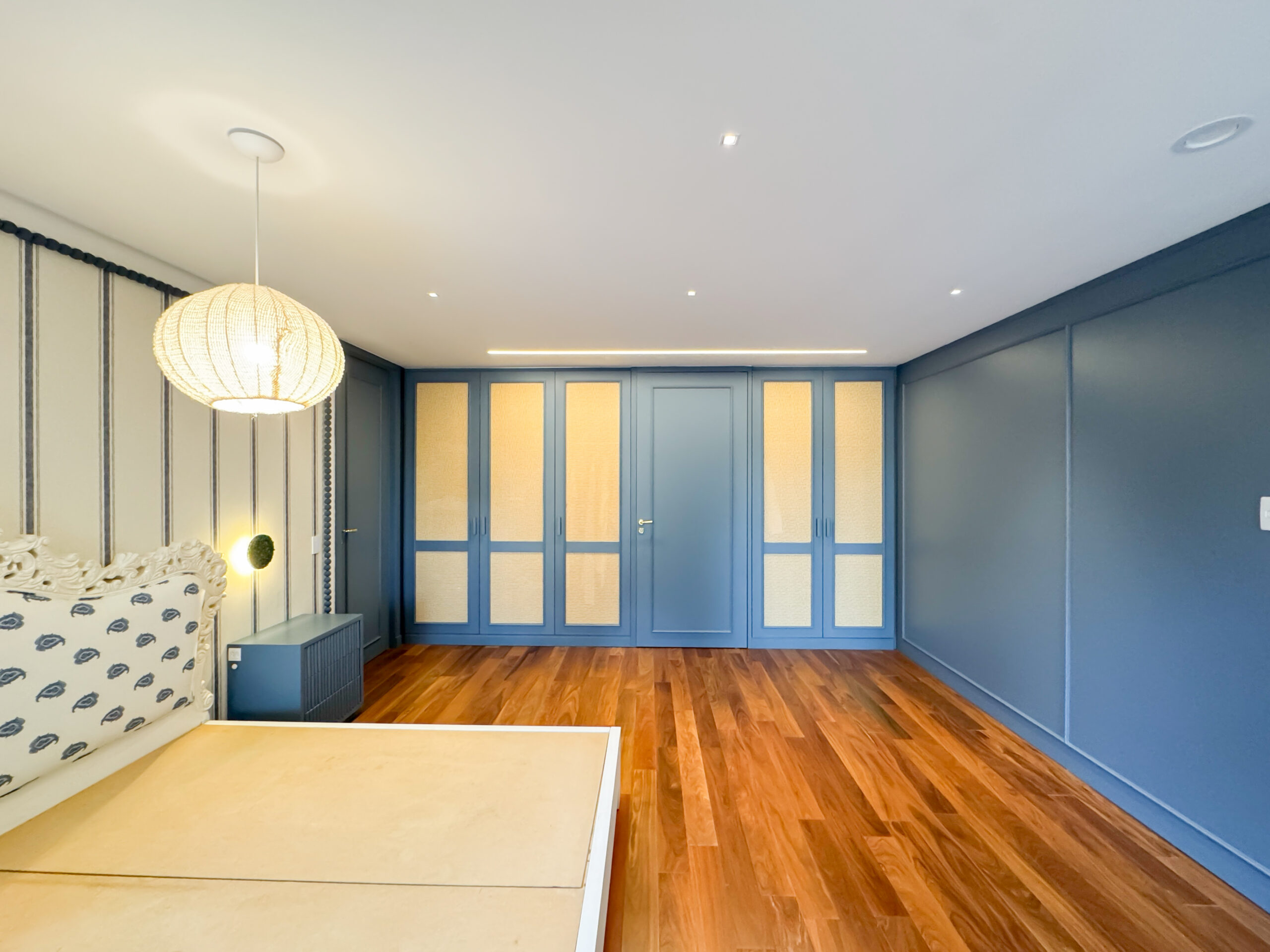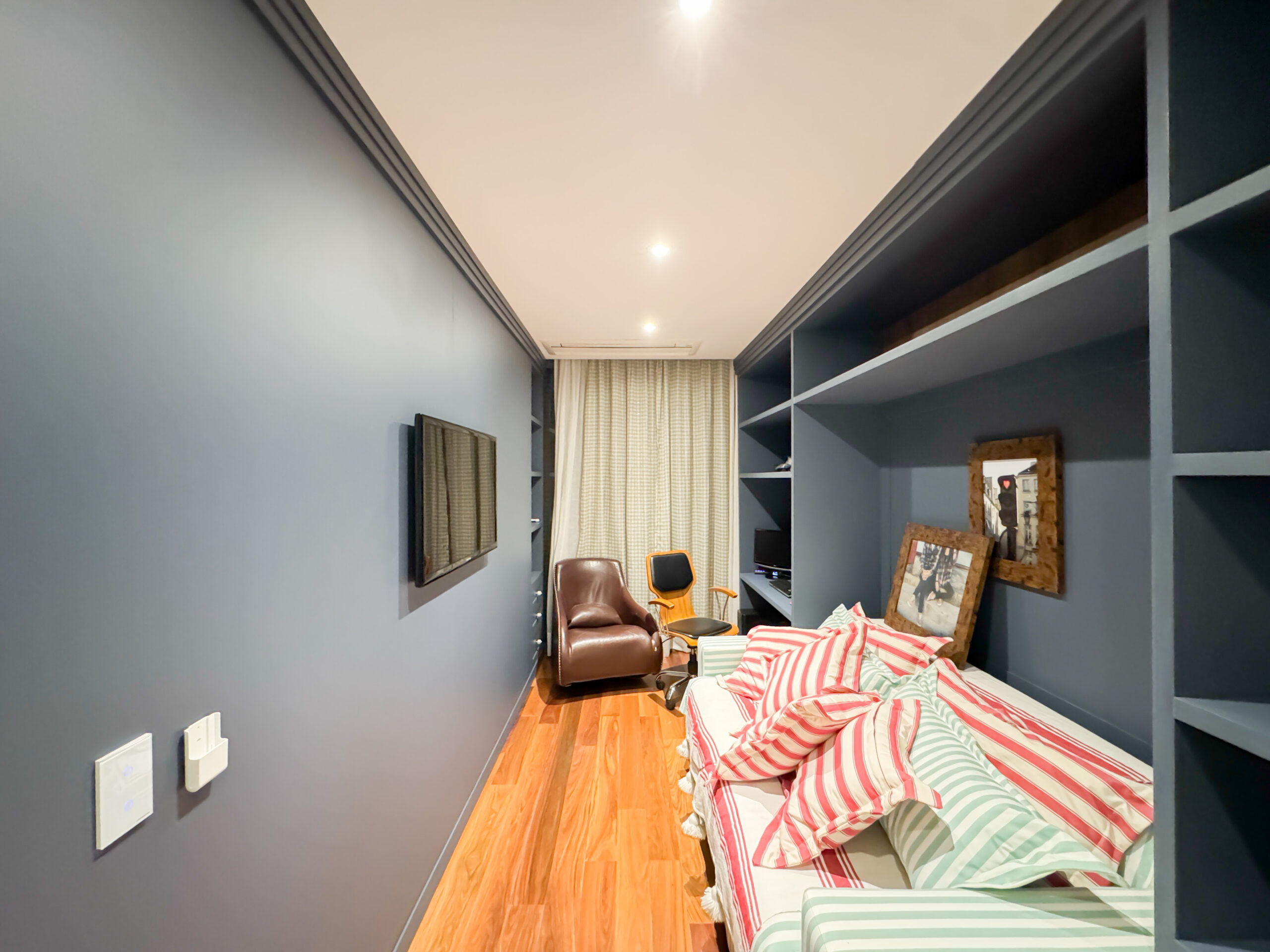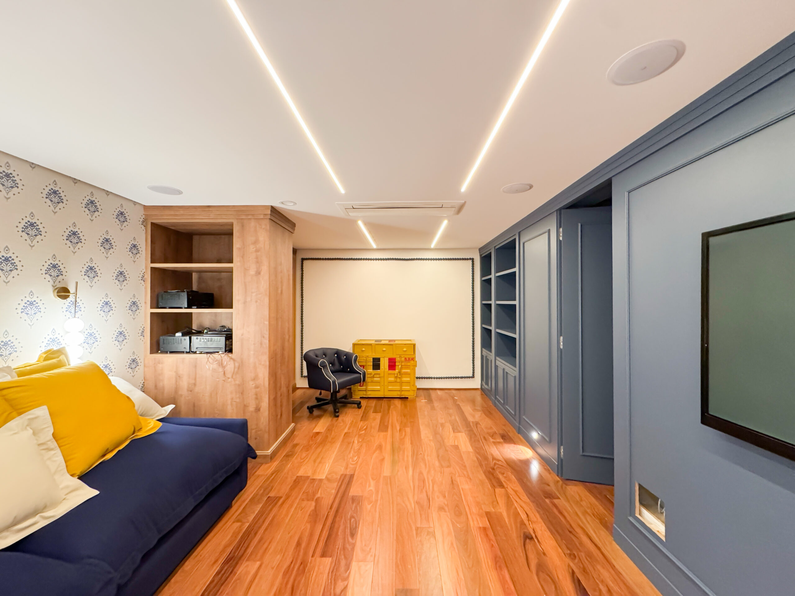 O trabalho abrangeu os quatro pavimentos da residência, desde a garagem subterrânea até a cobertura. Implementamos um sofisticado projeto de interiores com marcenaria planejada em todos os ambientes e um sistema de automação residencial de última geração, que proporciona controle total de iluminação, climatização e áudio com máximo conforto e praticidade.